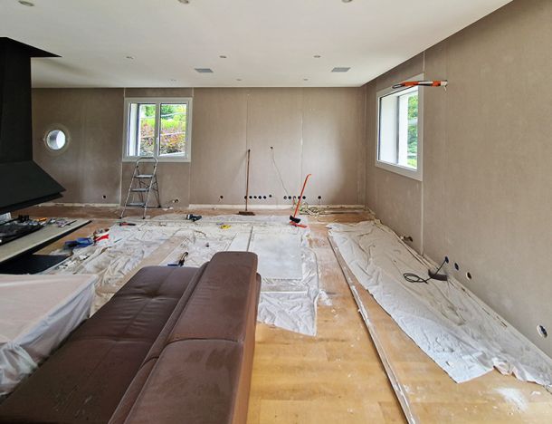 Dans le cadre de cette rénovation de salon, un doublage en placo a été réalisé afin de rattraper l’écart entre les anciens murs et les nouvelles menuiseries, suite au remplacement des fenêtres. Cette intervention a permis d’obtenir des surfaces planes et propres, prêtes à recevoir les finitions.