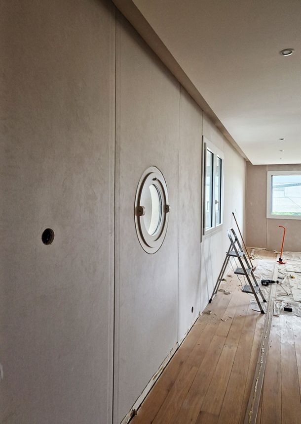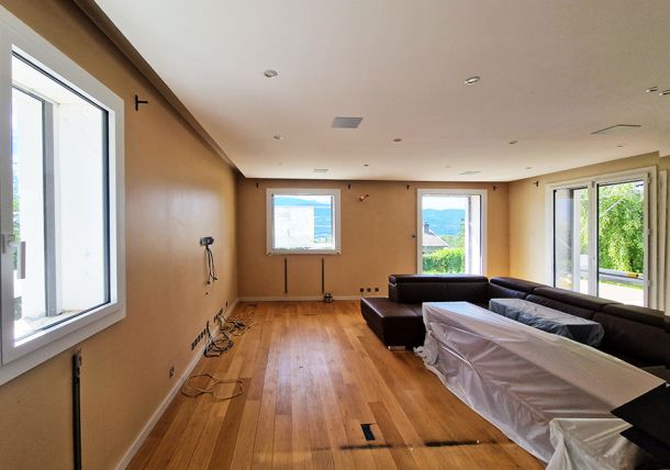 Dans le cadre de cette rénovation de salon, un doublage en placo a été réalisé afin de rattraper l’écart entre les anciens murs et les nouvelles menuiseries, suite au remplacement des fenêtres. Cette intervention a permis d’obtenir des surfaces planes et propres, prêtes à recevoir les finitions.