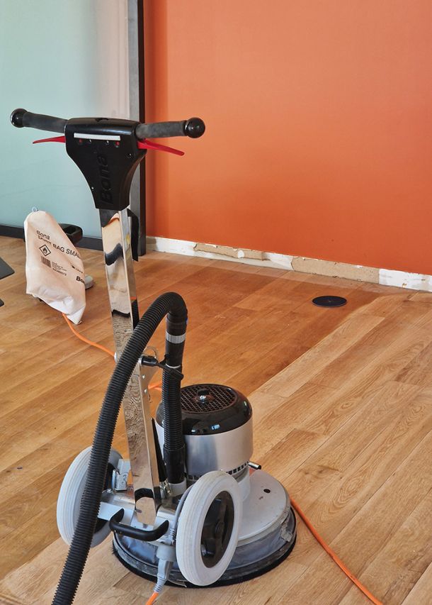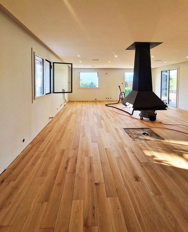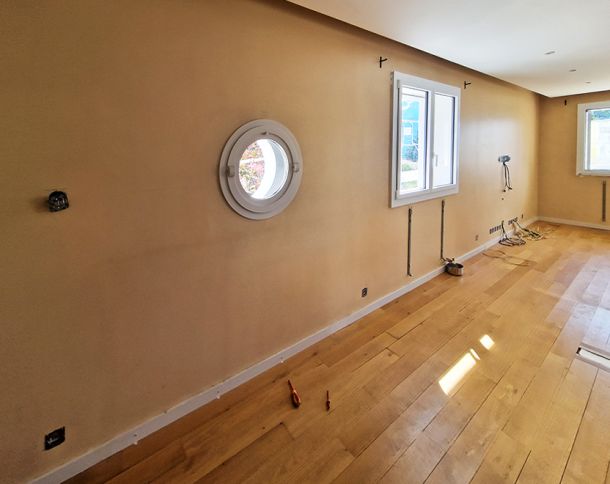 Le parquet massif en chêne a quant à lui été entièrement rénové : ponçage complet pour corriger le tuilage, remplacement de certaines lames trop endommagées, puis teinte et vitrification pour retrouver tout le charme du bois d’origine.