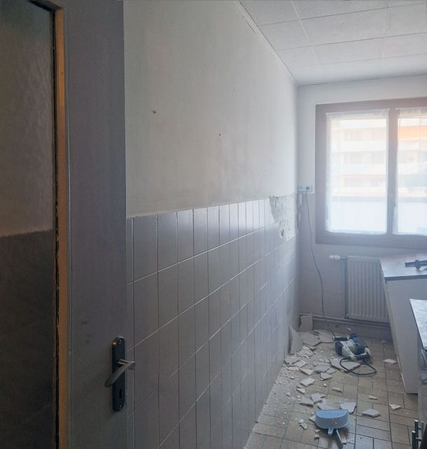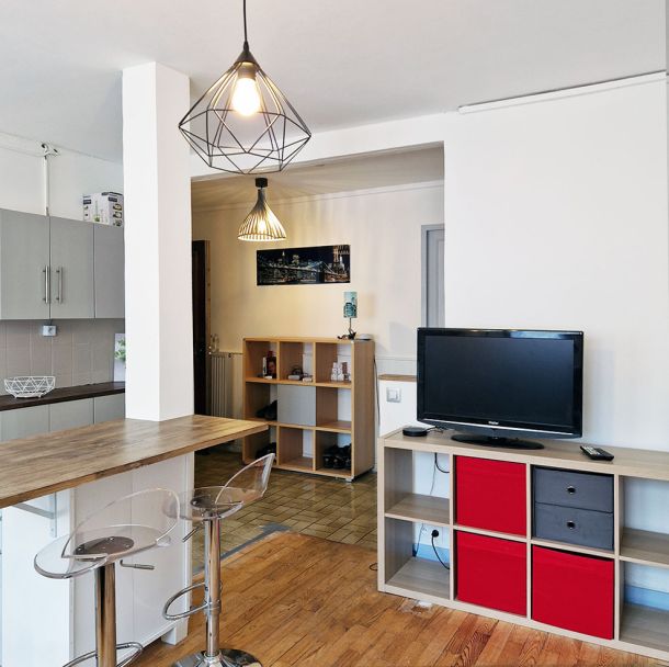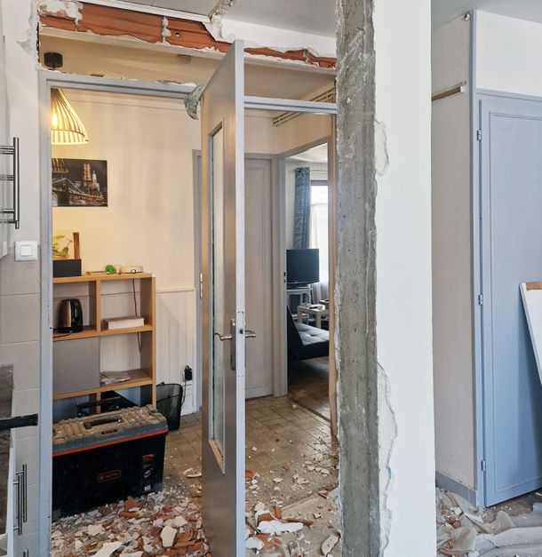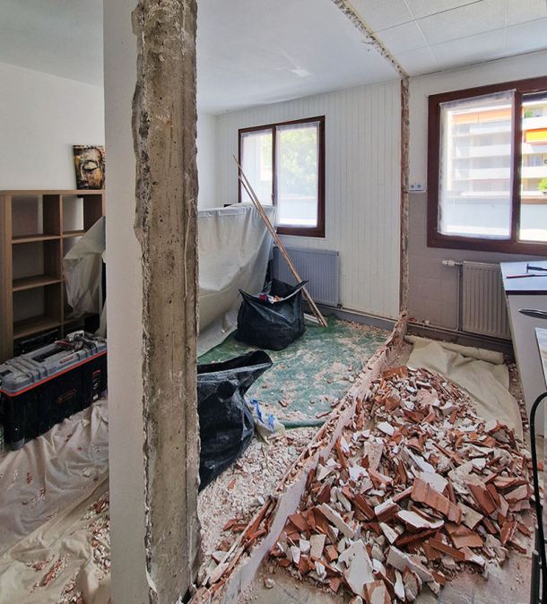 Dans cet immeuble datant des années 1960, la cuisine était très étroite, et le salon était isolé entre 3 chambres. Nous avons redistribué les pièces afin de transformer la chambre attenante à la cuisine en salon, et créer ainsi un grand espace salon sur cuisine ouverte. L'ancien salon a été transfomé en chambre. pour celà nous avons abbattu une cloison et créé une ouverture pour installer une porte. Ces transformations ont rendu cet appartement beaucoup plus fonctionnel et agréable à vivre, et ont donné de la valeur au bien.